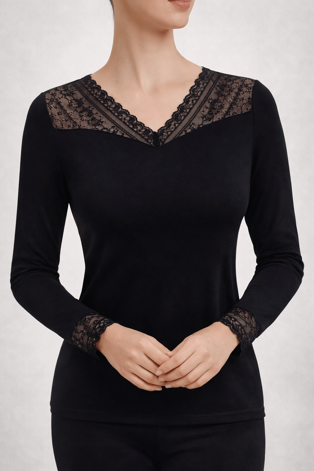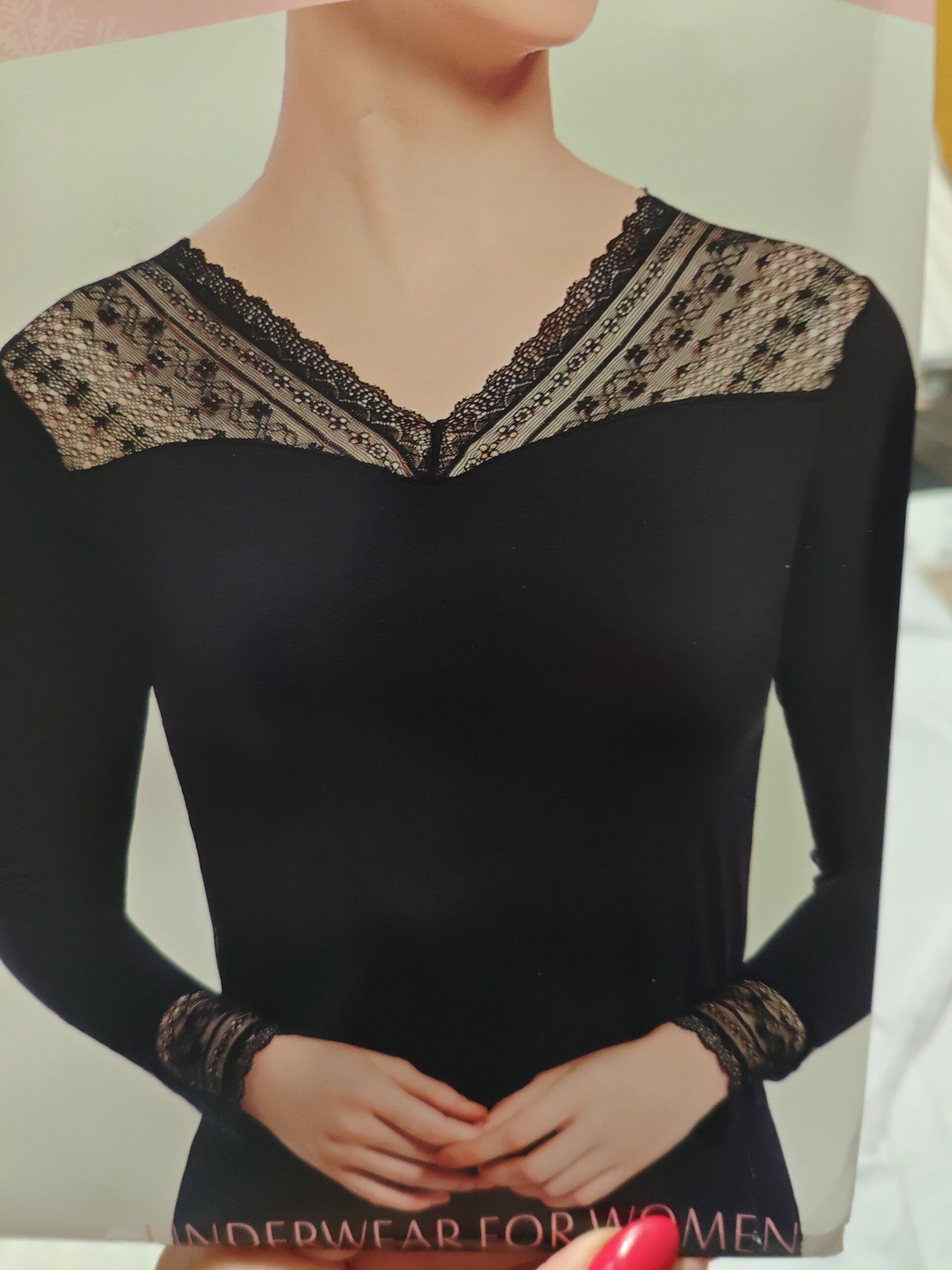 Camiseta térmica lencera de mujer, suave y elástica, con elegante escote en V adornado con encaje floral. Aporta abrigo ligero y un ajuste cómodo, ideal para llevar como prenda interior o exterior sin renunciar a un toque femenino y sofisticado.