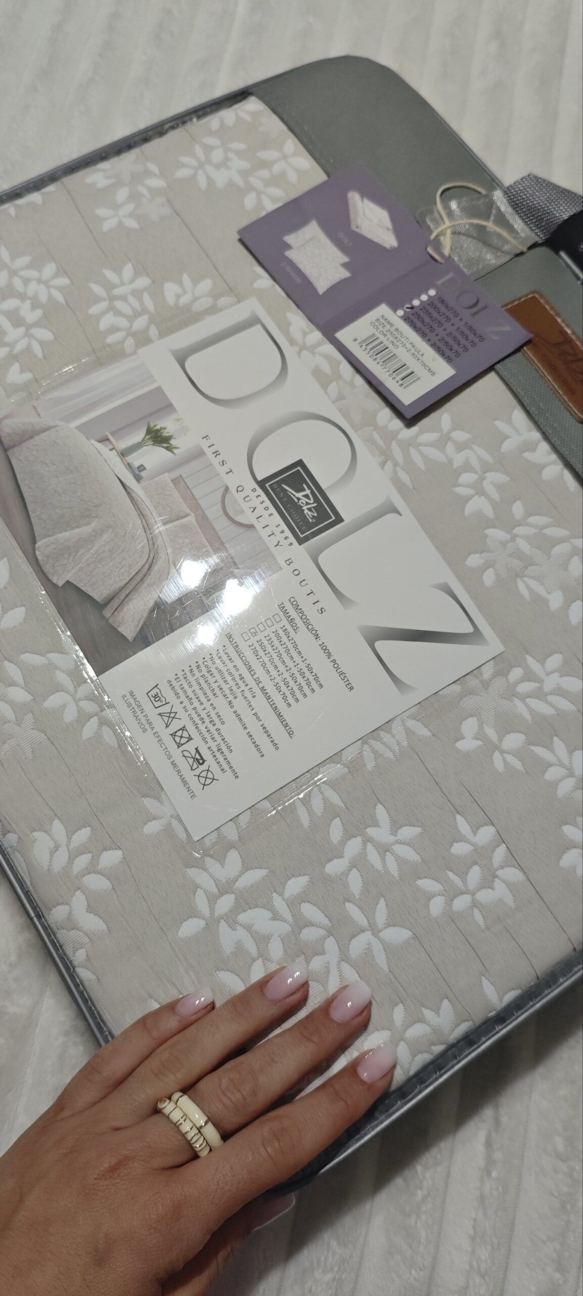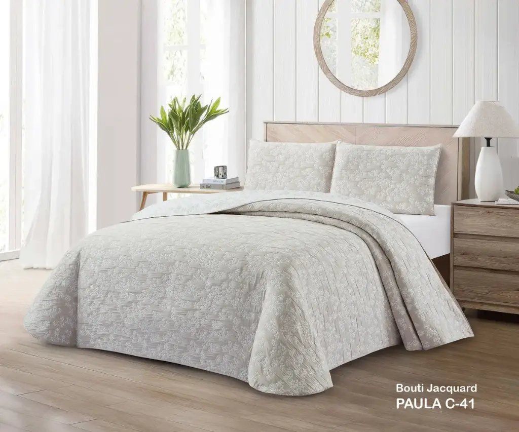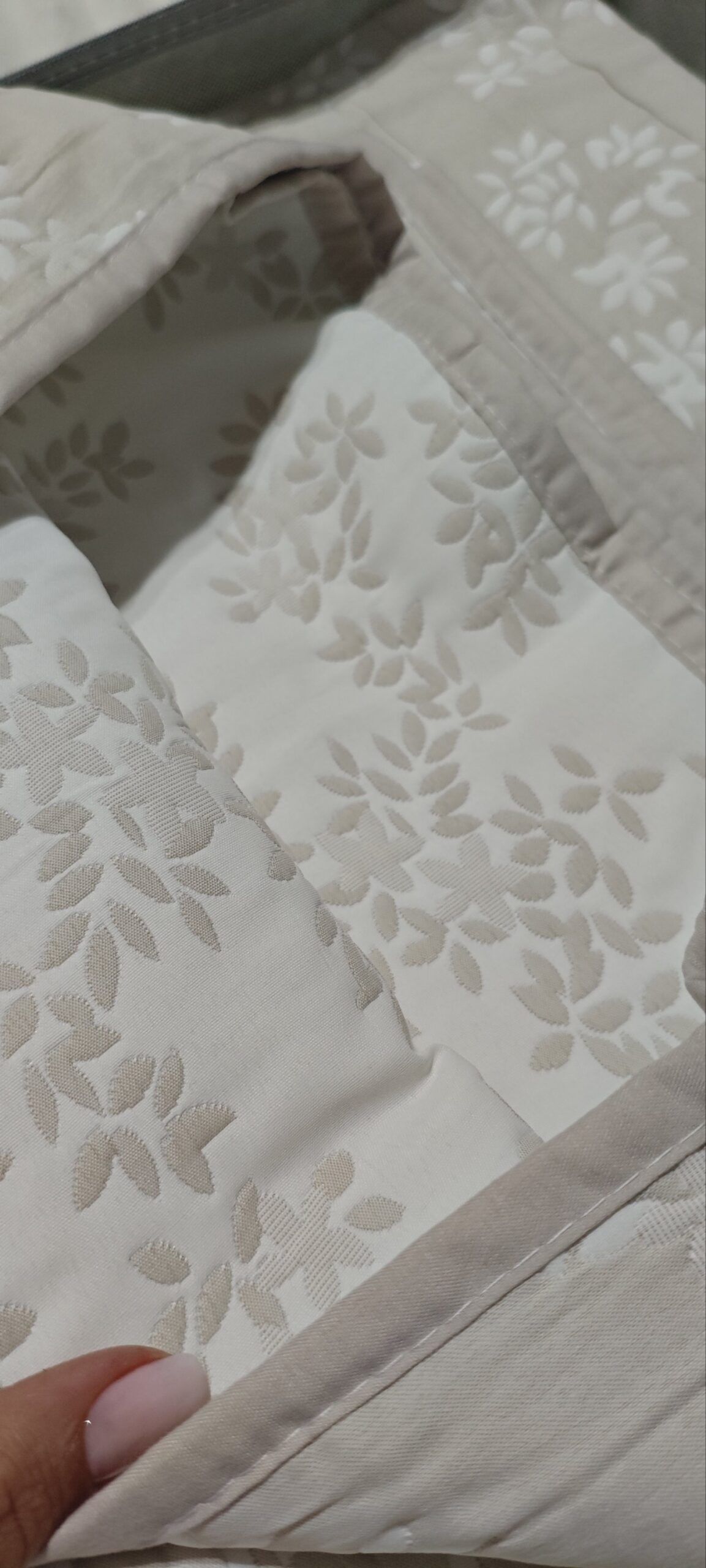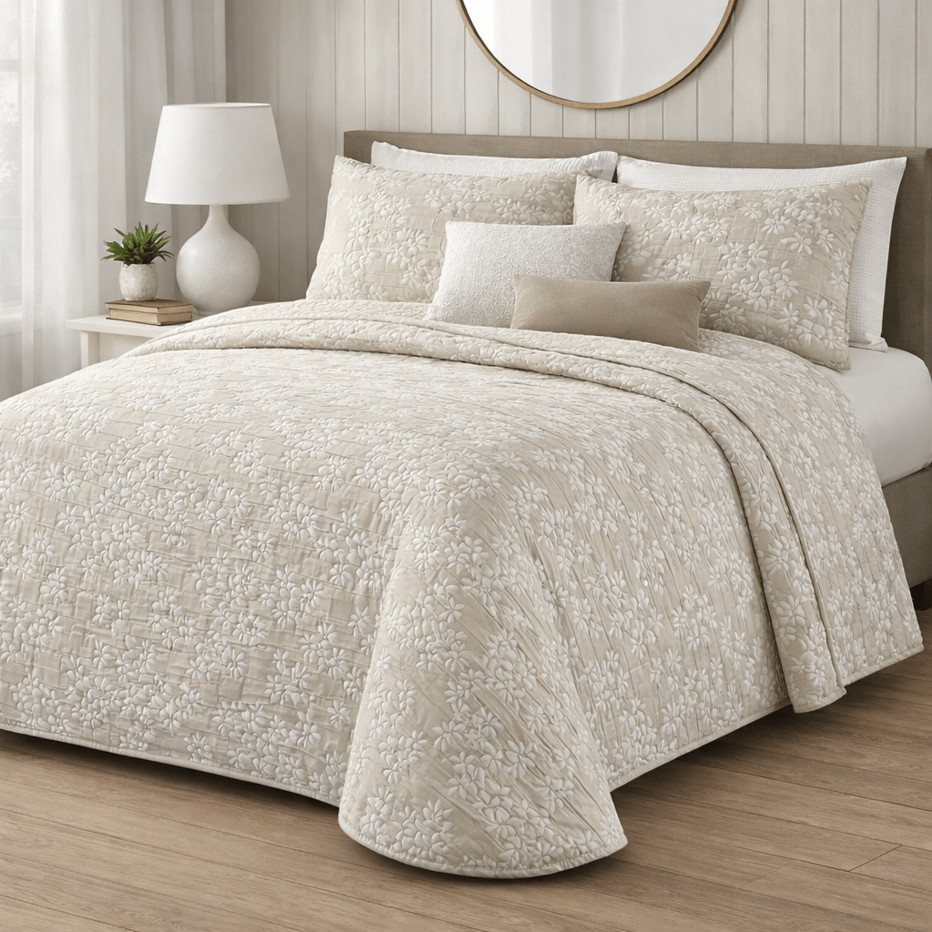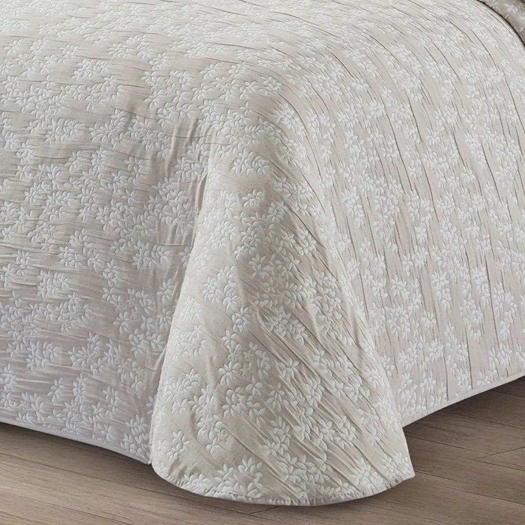 Colcha bouti en tono beige con elegante relieve floral, ideal para aportar luz y un estilo delicado al dormitorio. Su diseño suave y combinado en tonos neutros la hace perfecta para vestir la cama con un acabado acogedor y sofisticado.