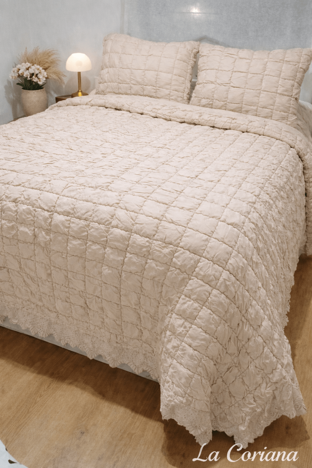 Incluye cojines a juego para un acabado completo y armonioso. Su diseño aporta volumen y textura, vistiendo el dormitorio con un estilo romántico y sofisticado.