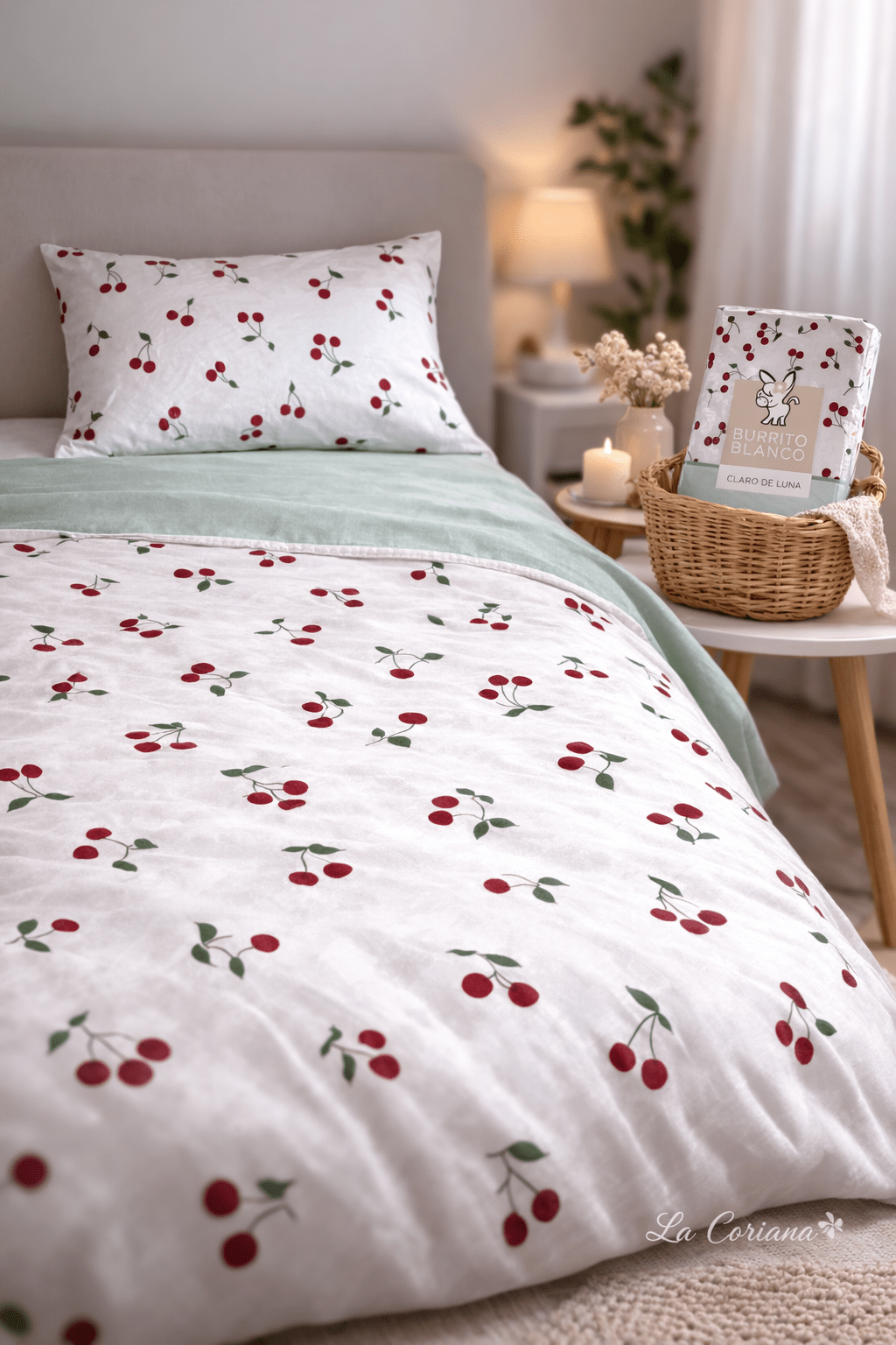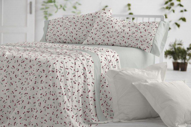 Este juego de sábanas está diseñado para quienes buscan practicidad sin renunciar al detalle. El estampado de cerecitas, de inspiración botánica, combina un fondo crudo luminoso con una paleta de verdes y el acento del fruto en tono cereza, muy en línea con el gusto escandinavo por lo natural y lo sereno. En el uso diario se traduce en una cama visualmente ligera, fácil de integrar en dormitorios contemporáneos.