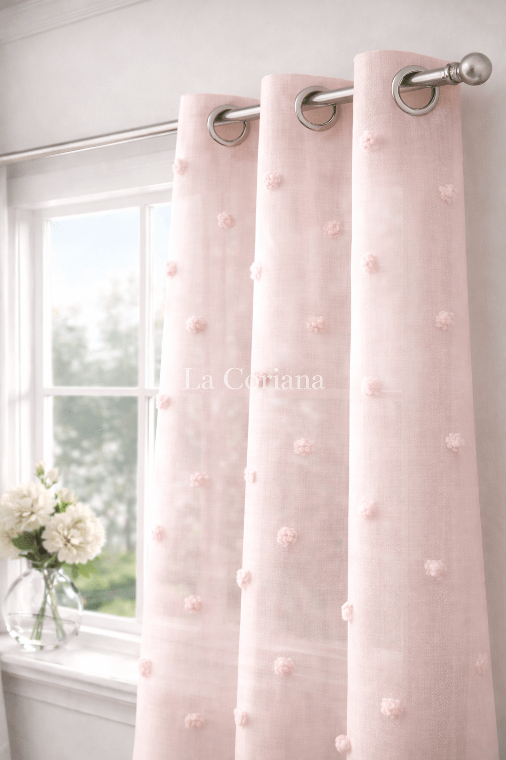 Visillo ligero y translúcido ideal para vestir la ventana aportando luz y delicadeza. Su tejido vaporoso deja pasar la claridad natural manteniendo la intimidad, y los pequeños pompones decorativos le dan un toque romántico y elegante. Confeccionado con ollaos metálicos para una colocación fácil y caída perfecta.